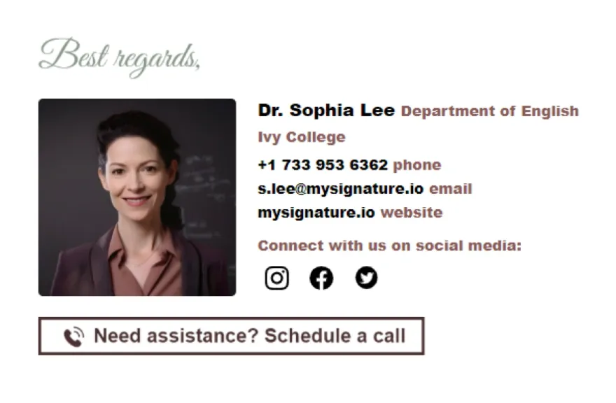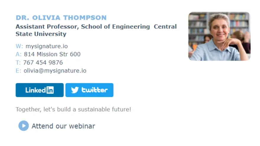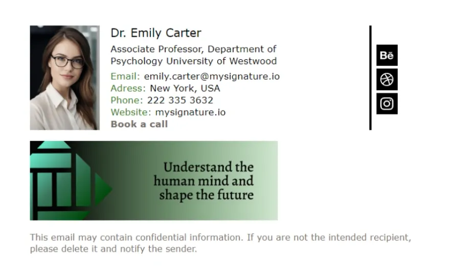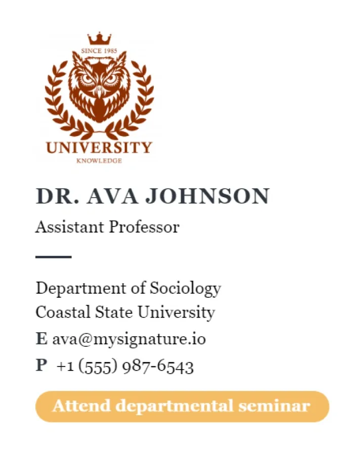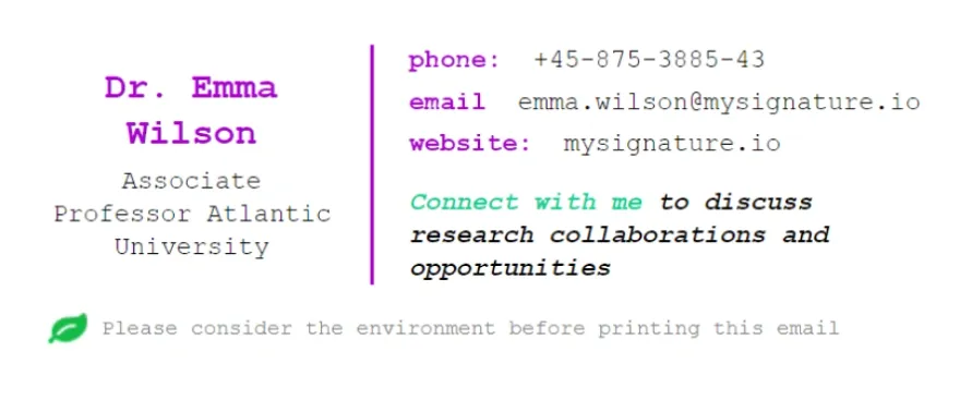 Procurando exemplos de assinaturas de e-mail acadêmicas? Nós selecionamos uma coleção de modelos profissionais e elegantes de assinatura de e-mail que vão ajudar você a aprimorar sua comunicação com alunos, colegas e parceiros acadêmicos.