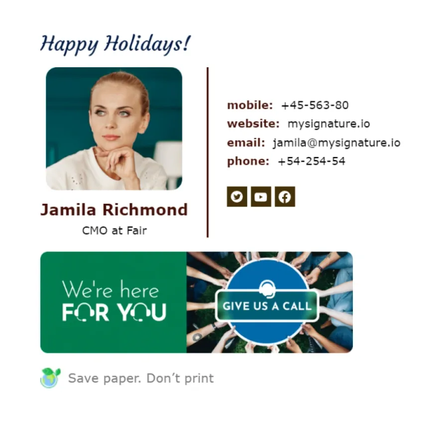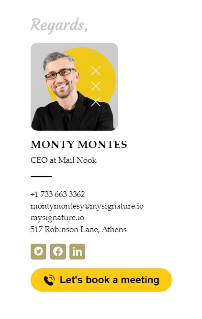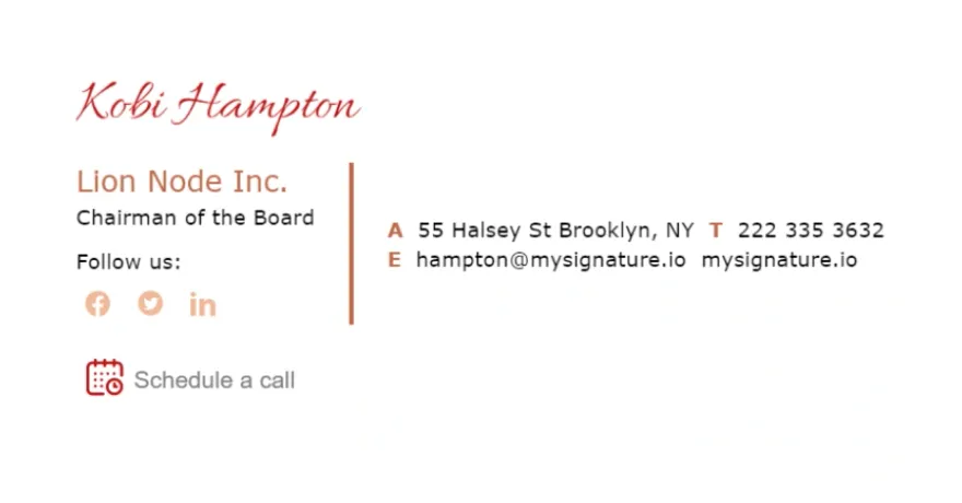 Agora que você já sabe como criar uma assinatura de e-mail para proprietário de empresa, vamos ver como tudo isso funciona na prática. Aqui estão alguns bons exemplos de assinaturas de e-mail para proprietário/presidente criadas com a ajuda de MySignature.