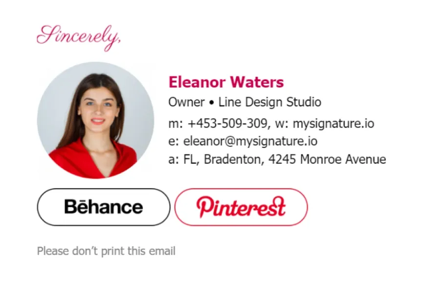 Se você deseja uma assinatura de e-mail bonita, opte por um design limpo e conciso que inclua apenas as informações mais relevantes. Não adicione seu endereço de e-mail.