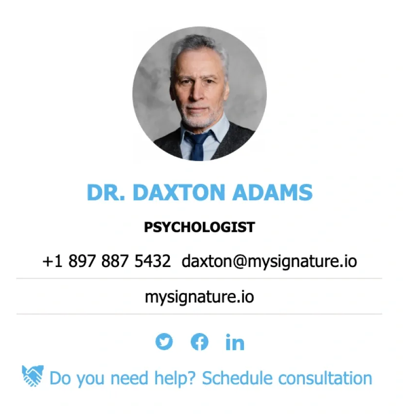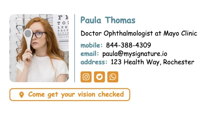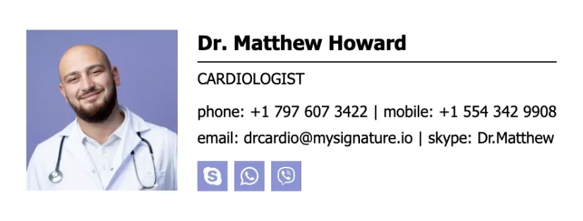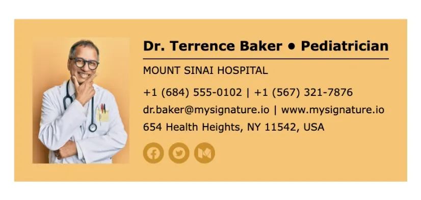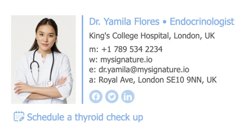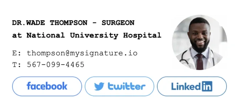 Criar uma assinatura de e-mailIncluir links para perfis de redes sociais na assinatura de e-mail de um médico é opcional, mas no mundo digital de hoje pode ser uma maneira útil de compartilhar informações valiosas com os pacientes. Se você tiver um perfil profissional em rede social diretamente relacionado ao seu trabalho como médico, incluí-lo pode ajudar os pacientes a se manterem informados e engajados com sua prática médica. Ao usar um bom criador de assinaturas como MySignature, você pode adicionar ícones clicáveis ao rodapé do seu e-mail.