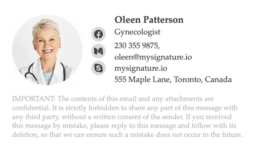 Outra consideração importante ao criar uma assinatura de e-mail profissional para médicos é mantê-la concisa. Embora você possa ficar tentado a incluir todas as qualificações, certificações ou credenciais que possui, um rodapé de assinatura de e-mail sobrecarregado pode parecer pouco profissional e cansativo. Em vez disso, concentre-se em incluir apenas as informações mais importantes e relevantes, como seu nome, cargo e contatos. Trataremos desse tópico em mais detalhes abaixo.