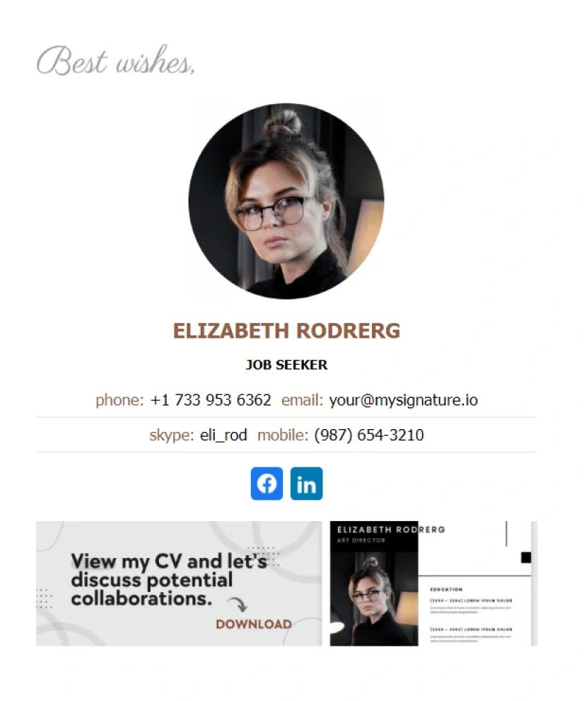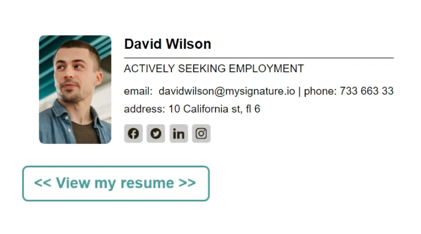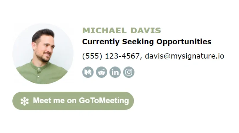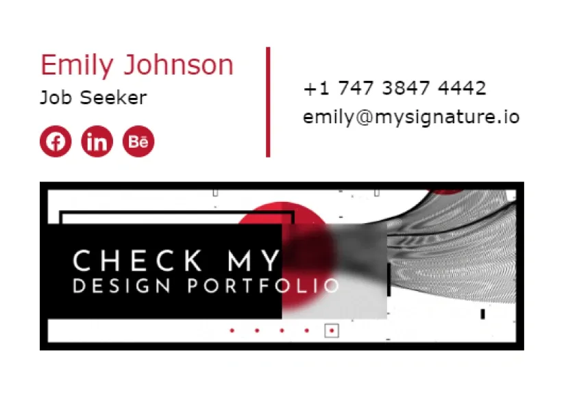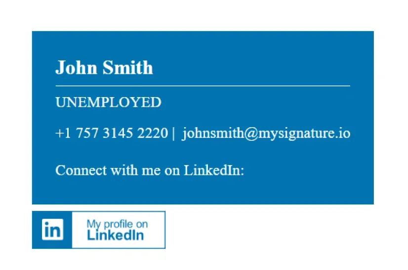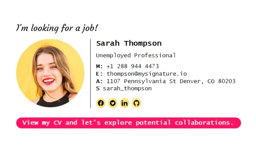 Experimente estes modelos de assinatura de e-mail para quem está em busca de emprego. Mais modelos de assinatura de e-mail profissionalmente projetados para quando você estiver desempregado estão disponíveis em MySignature.