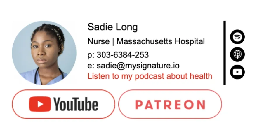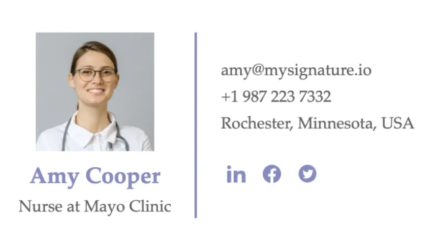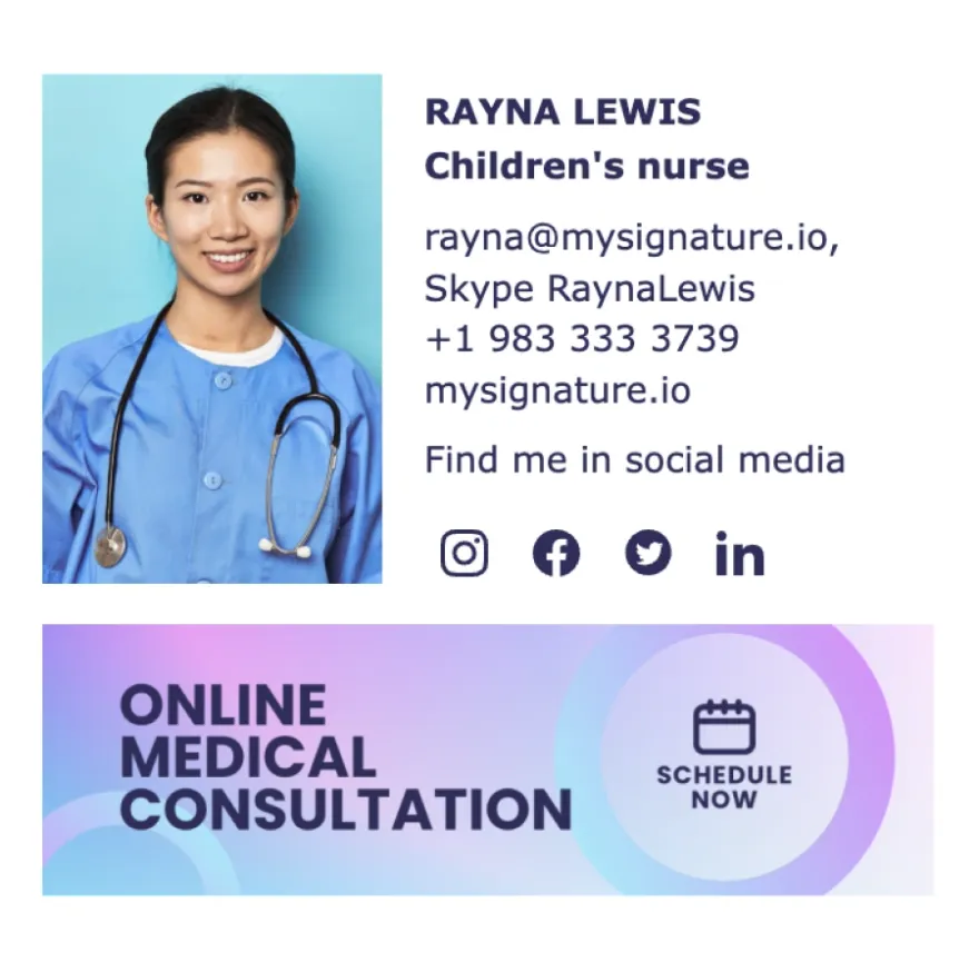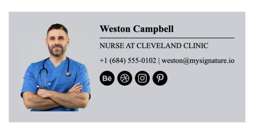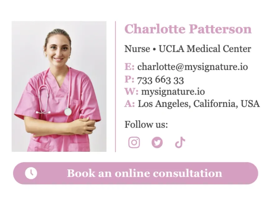 Simplifique sua comunicação e cause uma impressão duradoura com nossos modelos de assinatura de e-mail para enfermeiros, profissionalmente desenvolvidos. Todos feitos com a ajuda de MySignature.io.