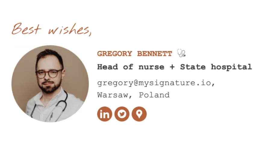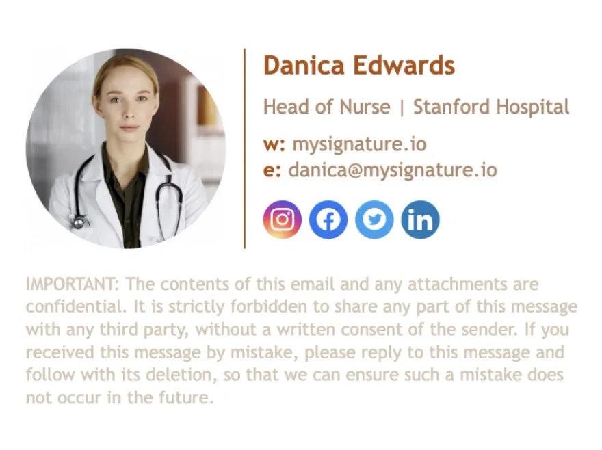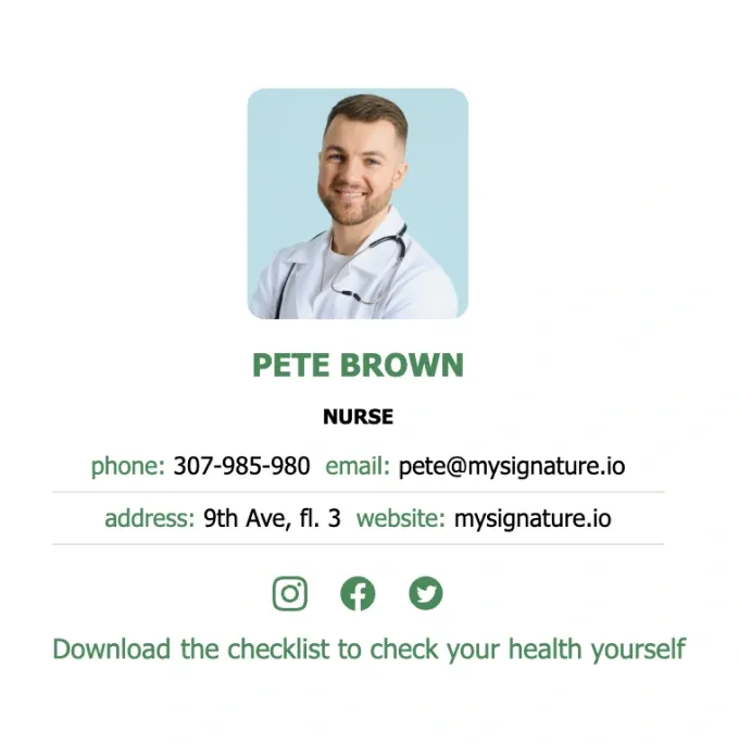 Permita que o destinatário mantenha conexão com seu hospital em nível profissional e social, oferecendo acesso fácil aos perfis oficiais nas redes sociais (Facebook, LinkedIn, Twitter, etc). Se você deseja tornar sua assinatura interativa e com aparência profissional, experimente o gerador de assinaturas de e-mail MySignature.io, que ajudará você a criar a assinatura perfeita em minutos.