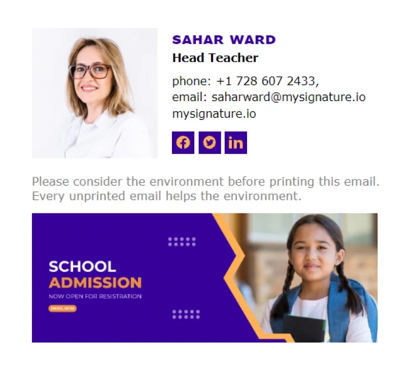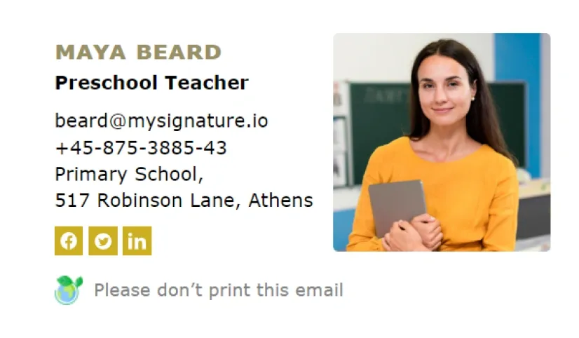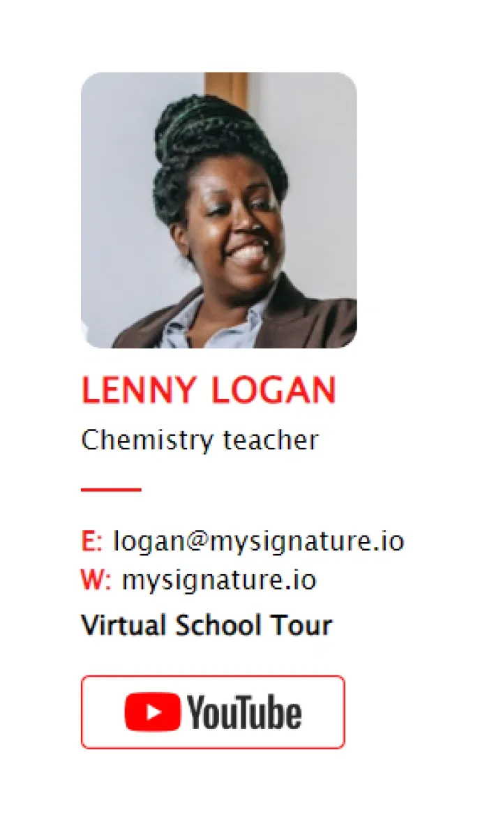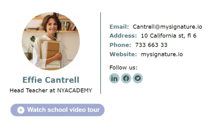 Ela não possui gráficos chamativos ou cores que distraiam. Em vez disso, apresenta um design limpo, uniforme e profissional, com espaço suficiente para uma foto e todas as informações que alunos ou pais possam precisar em um espaço reduzido. Essa assinatura de e-mail poderia ter mais elementos, mas mostra que, com um bom design, é possível incluir muitos detalhes sem sobrecarregar suas mensagens. E isso será útil sempre que você enviar e-mails para um aluno ou responsável.