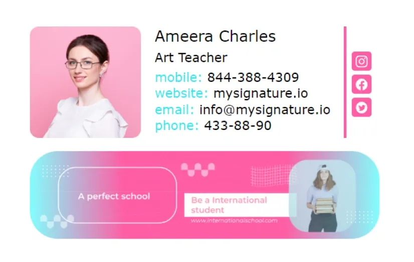 Criar uma assinatura de e-mailManter alunos e pais informados pode ser um desafio. Por isso, se você tiver um link importante para compartilhar, eventos futuros para divulgar, como uma excursão escolar, ou até mesmo uma página relevante para as pessoas com quem está se comunicando, pode tornar essas informações visíveis de forma destacada usando um banner. Ao usar a MySignature, você pode aproveitar uma variedade de banners chamativos que fazem parte da coleção de modelos e que se encaixam perfeitamente no design da assinatura de e-mail. Ter esses recursos à disposição torna muito mais fácil descobrir como criar uma assinatura de e-mail para professor.