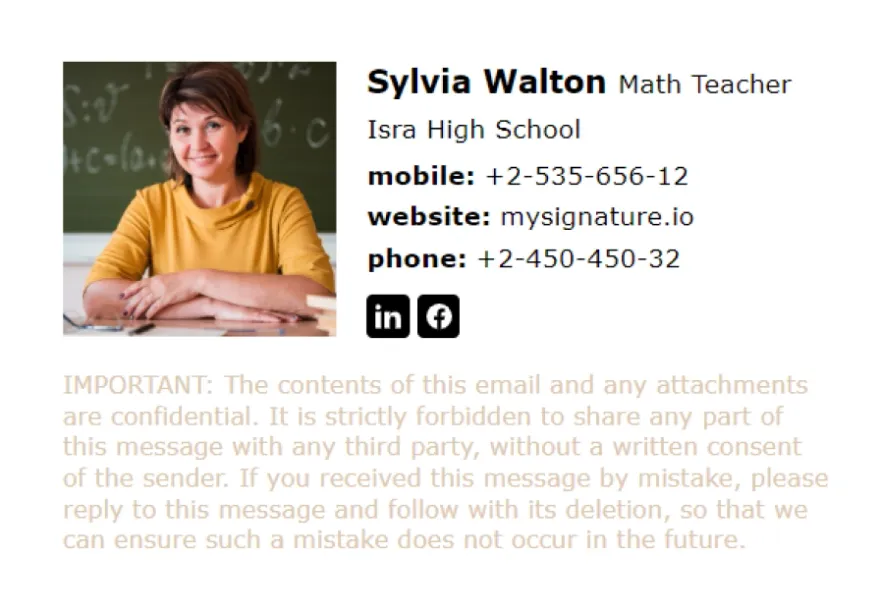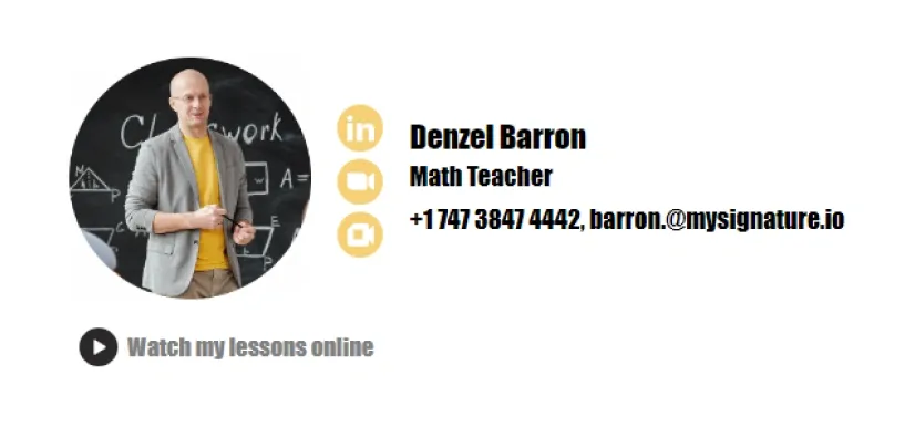 A melhor maneira de encontrar a opção certa é analisar alguns exemplos de assinaturas de e-mail para professores. E na MySignature, você encontrará uma seleção de modelos profissionais de assinatura de e-mail para professores em qualquer situação.